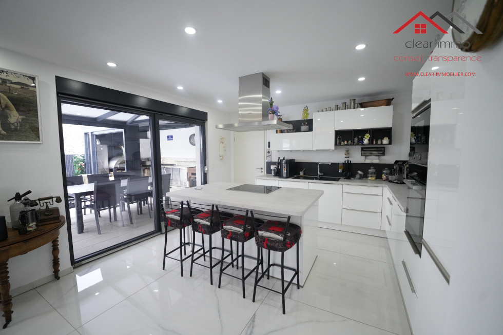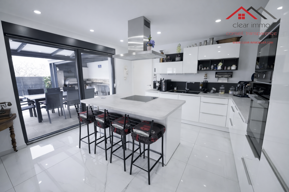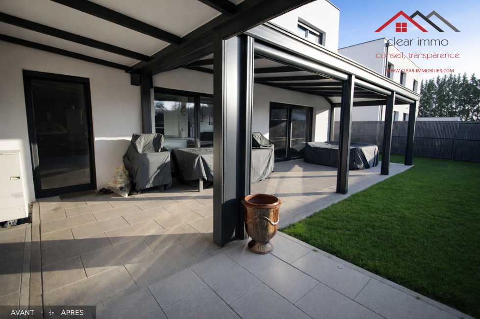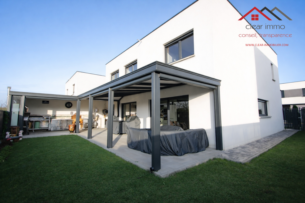Édifiée sur un terrain de 3,44 ares, cette propriété développe 155 m² habitables, complétés par un garage spacieux de 35 m², deux stationnements extérieurs et un espace extérieur soigneusement aménagé, sublimé par une grande pergola haut de gamme exposée ouest.