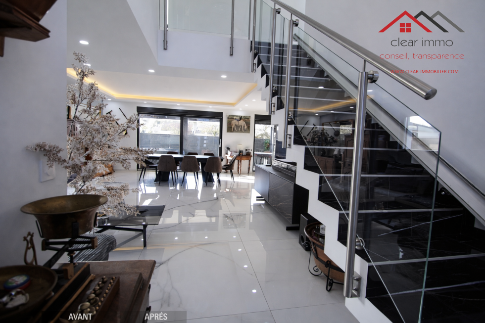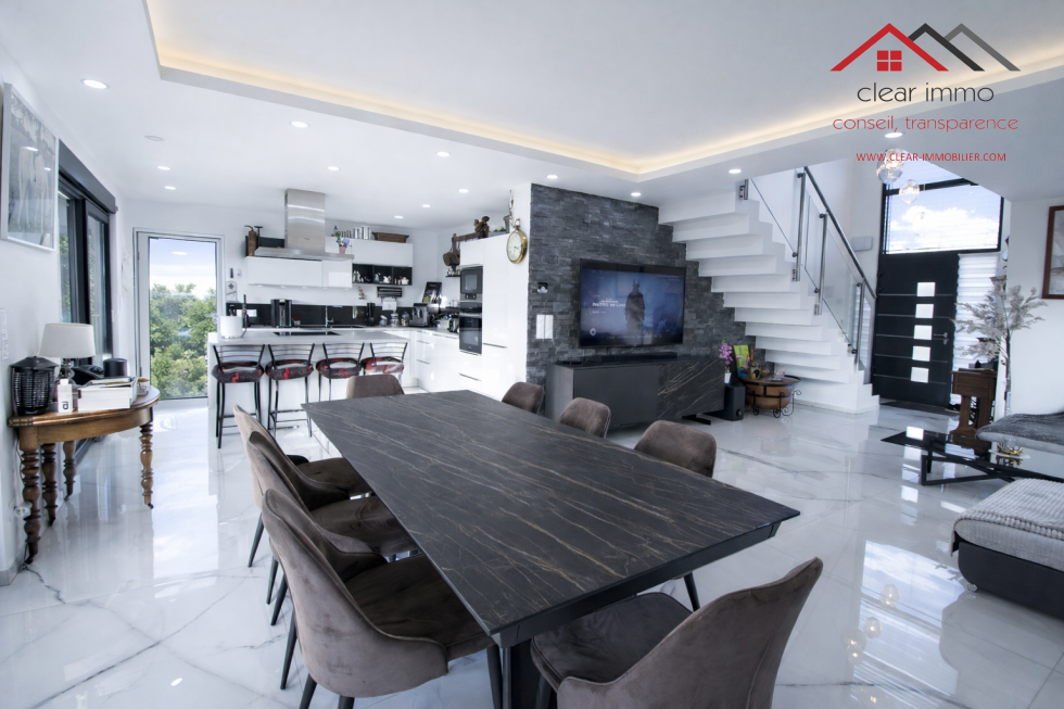 Dès l’entrée, la maison séduit par son esthétique contemporaine, ses lignes épurées et ses matériaux de qualité ainsi que des volumes généreux baignés de lumière
